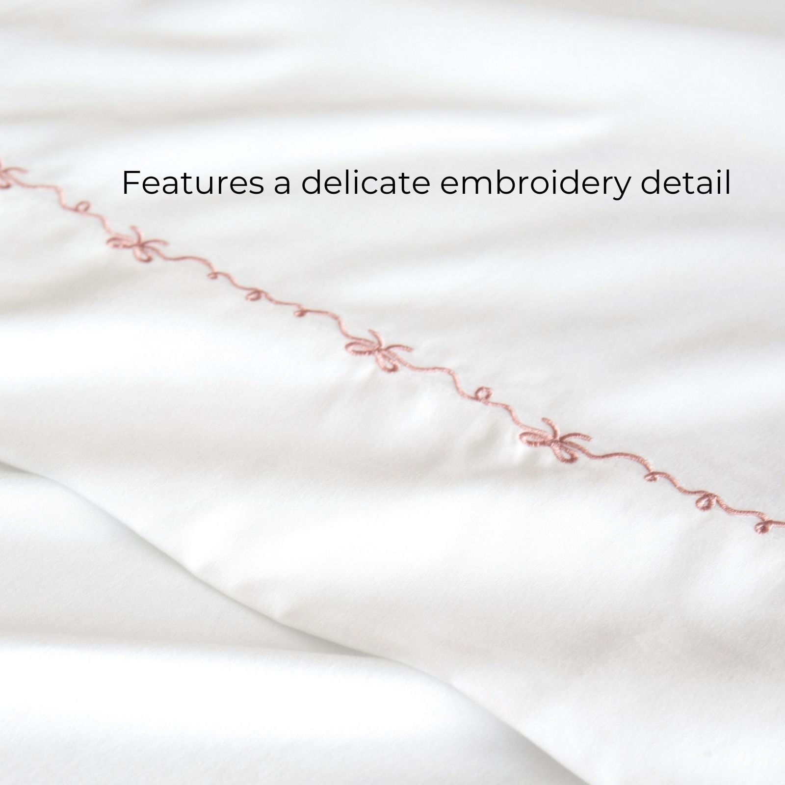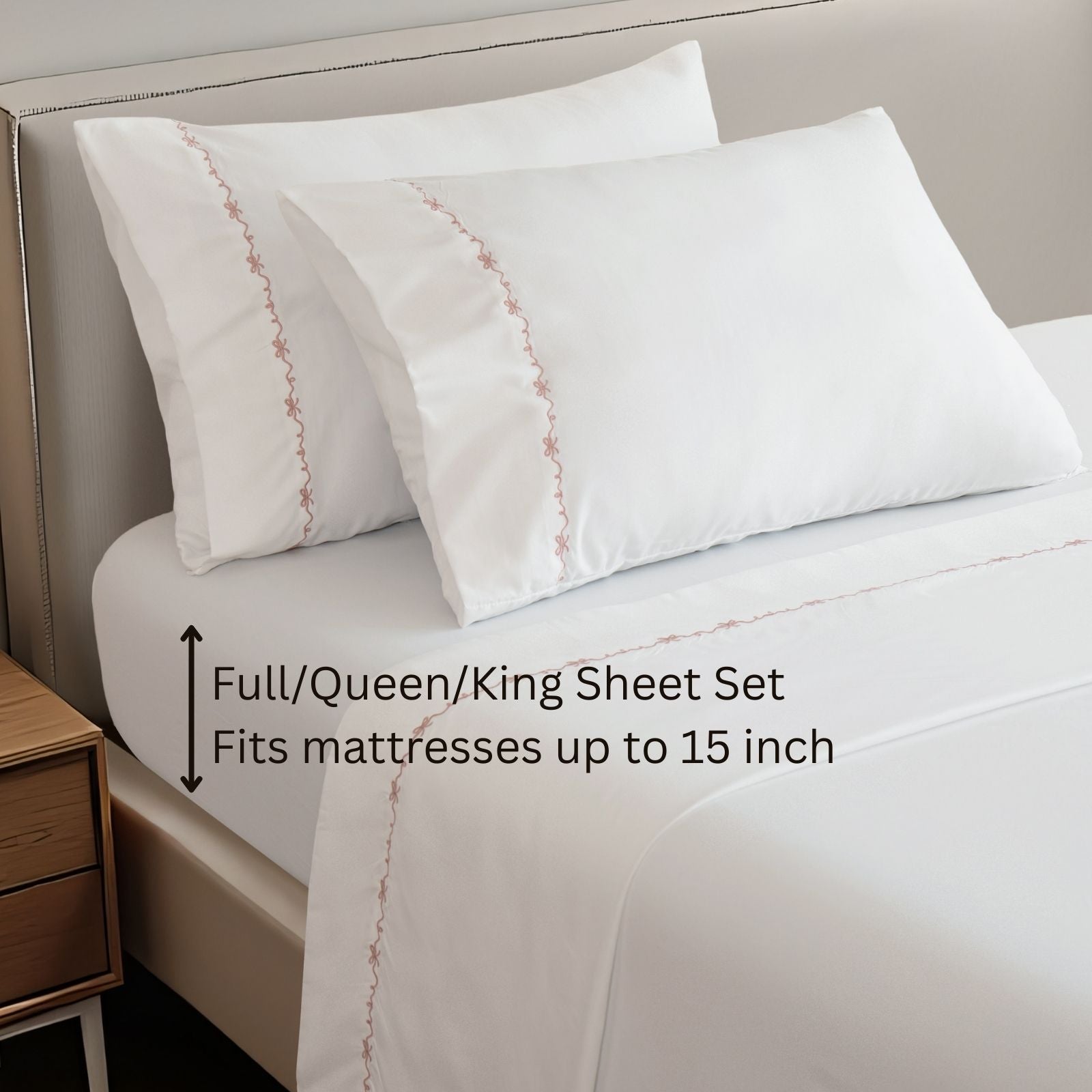 Elevate your sleep space with the Pyxie Home Embroidered Pink/Blush Bow Sheet Set collection designed for both style and comfort. This set features elegant bow embroidery along the flat sheet and pillowcase edges, adding a sophisticated and minimalist detail to your bedding. Crafted from premium pre-washed 100% microfiber polyester, these sheets offer a lightweight, breathable, and luxurious feel with exceptional durability for year-round comfort. The set includes one flat sheet, one fitted sheet and one or two pillowcases. Enjoy easy care as these wrinkle-resistant sheets are machine washable and tumble dry, maintaining their crisp feel and color with every wash. Made in China